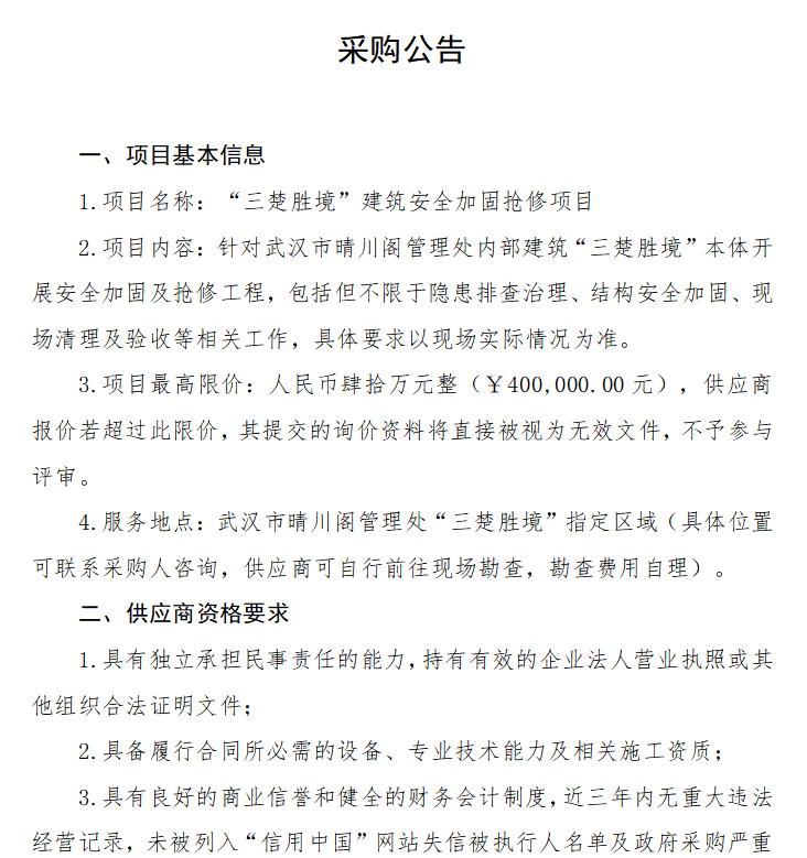 “三楚胜境”建筑安全加固抢修项目采购公告